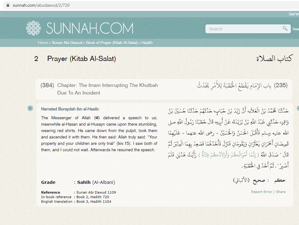 The Messenger of Allah (saw) delivered a speech to us; meanwhile, al-Hasan and al-Husayn came upon there stumbling, wearing red shirts. He came down from the pulpit, took them and ascended it with them. He then said: Allah truly said: “Your property and your children are only (fitnat) trial” (Ixiv.15). I saw both of them, and I could not wait. Afterwards, he resumed the speech.