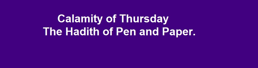 Ibn `Abbas said, “When the ailment of the Prophet (saw) became worse, he said, ‘Bring for me (writing) paper and I will write for you a statement after which you will not go astray.’ But `Umar said, ‘The Prophet is seriously ill, and we have got Allah’s Book with us and that is sufficient for us.’ But the companions of the Prophet (saw) differed about this and there was a hue and cry. On that the Prophet (saw) said to them, ‘Go away (and leave me alone). It is not right that you should quarrel in front of me.” Ibn `Abbas came out saying, “It was most unfortunate (a great disaster) that Allah’s Messenger (saw) was prevented from writing that statement for them because of their disagreement and noise. (Note: It is apparent from this Hadith that Ibn `Abbas had witnessed the event and came out saying this statement. The truth is not so, for Ibn `Abbas used to say this statement on narrating the Hadith and he had not witnessed the event personally. See Fath Al-Bari Vol. 1, p.220 footnote.) (See Hadith No. 228, Vol. 4).