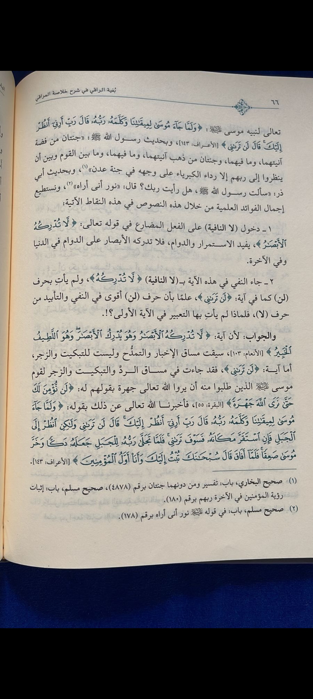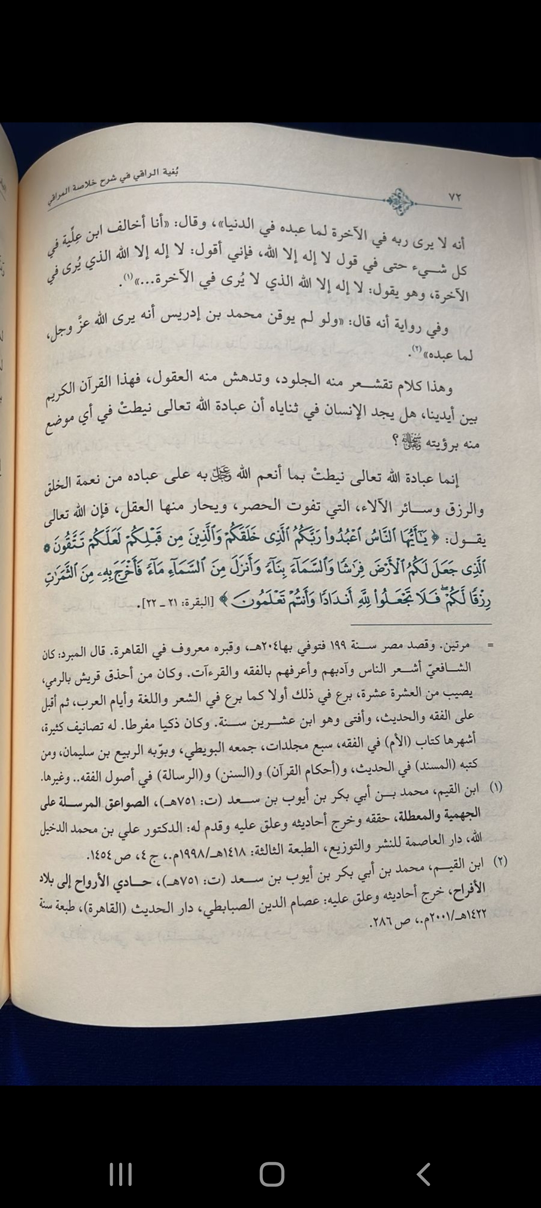 And they hold that seeing Allah is the thing that made Allah the Exalted worthy to be worshiped, and that if he Allah Tabaraka wa Ta’ala was not seen in the Akhira then he was not worthy to be worshiped in this dunya, and to you some of what they said: we find ibn Al Qayyim links to Imam Shafi’e that he said “if Mohammed bin Idrees did not known that he won’t see his lord in the akhira then he wouldn’t have worshiped him” and he said “I oppose ibn Aliyyah in everything even in saying La Illaha Illa Allah, as I say: la Illaha Illa Allah that can be seen in the akhira, and he says: La Illaha Illa Allah that cannot be seen in the Akhira…” and in another narration he said “ If Mohammed ibn Idrees was not certain that he’ll see Allah Azza Wa Jal he wouldn’t have worshiped him”. And this is talk that makes bodies grasp, and minds flabbergasted, as this is the Quran within our hands, we do not find that that the worship of Allah the Exalted was conditioned in any position of it with seeing him swt!! This is the belief of the Atheist!