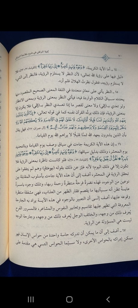This Ayah came in the context of describing the day of judgment, and the day of gathering to be exact. And that’s by the proof of its context {{On that Day ˹some˺ faces will be bright,() Awaiting the mercy of their lord ()And ˹other˺ faces will be gloomy,() ا ِض َرةٌ ُو ُجوهٌ َيْو َمِئٍذ } {.in anticipation of something devastating ن )22ٰ )ى َّ لَ ِإ َنا ِظ َرةٌ )23ِ )إ َرِّب َها َت ن ُظ َبا ِس َرةٌ )24ُّ )ن َوُو ُجوهٌ َيْو َمِئٍذ َأ َع َل َأ ُيف َها ْ ِ ٌرة َقِفا َب { so if (Nathira) (ناظرة (was of the meaning of seeing then it won’t be except on that day; because he described that by saying (on that day) (ذٍيومئ (and those who differ with us they have not agreed on it happening on the gathering, add to that, the ayah came with the style of comparison between two types of faces, so these are radiant, happy, waiting for the mercy of its lord, while the others are contorted and gloomy expecting what will break their backs from punishment. So, it’s in pity waiting for it to come. Add to that that the description by faces in this ayah means the known organ which the feelings appear on. What is in the soul. What the soul is feeling will be expressed on the face. As the contentment and happiness can be identified through his face, and fearful and frightened can also be identified by his face, and the face organ is not the organ responsible for seeing.