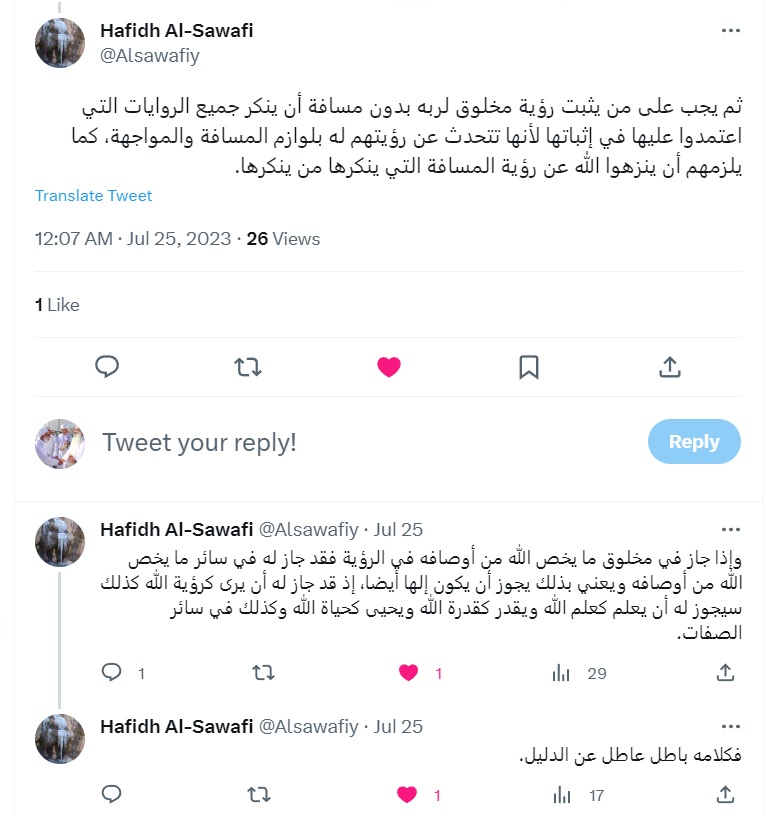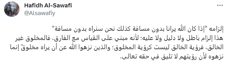 Our noble teacher Shaykh Hafidh Al Sawafi replies to the respected Dr. Hamza Bakr on the reasoning he posits for distance and seeing Allah in the afterlife.