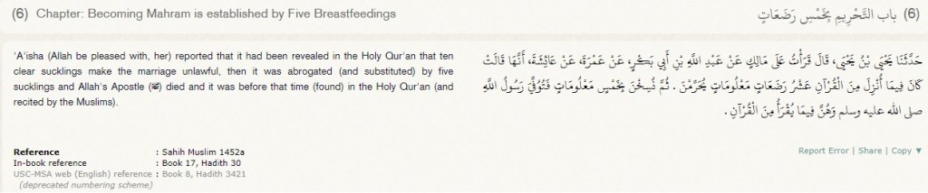 ‘A’isha (Allah be pleased with, her) reported that it had been revealed in the Qur’an that ten clear sucklings make the marriage unlawful, then it was abrogated (and substituted) by five sucklings and Allah’s Apostle (may peace be upon him) died and it was before that time (found) in the Qur’an (and recited by the Muslims).