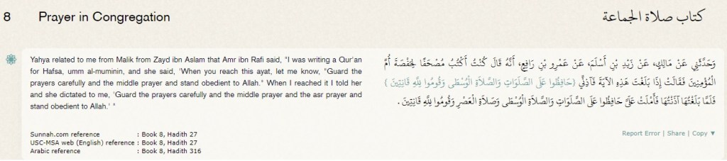 “Yahya related to me from Malik from Zayd ibn Aslam that Amr ibn Rafi said, “I was writing a Qur’an for Hafsa, umm al-muminin, and she said, ‘When you reach this ayat, let me know, “Guard the prayers carefully and the middle prayer and stand obedient to Allah.”‘ When I reached it I told her and she dictated to me, ‘Guard the prayers carefully and the middle prayer and the asr prayer and stand obedient to Allah.”