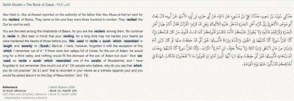 “We used to recite a surah similar to one of the Musabbihaat, and I no longer remember it but this much I have indeed preserved: ‘O you who truly believe why do you preach that which you do not practice?’ (and) ‘that is inscribed on your necks as a witness and you will be examined about it on the Day of Resurrection.’