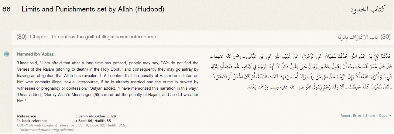 `Umar said, “I am afraid that after a long time has passed, people may say, “We do not find the Verses of the Rajam (stoning to death) in the Holy Book,” and consequently they may go astray by leaving an obligation that Allah has revealed. Lo! I confirm that the penalty of Rajam be inflicted on him who commits illegal sexual intercourse, if he is already married and the crime is proved by witnesses or pregnancy or confession.” Sufyan added, “I have memorized this narration in this way.” `Umar added, “Surely Allah’s Messenger (saw) carried out the penalty of Rajam, and so did we after him.”