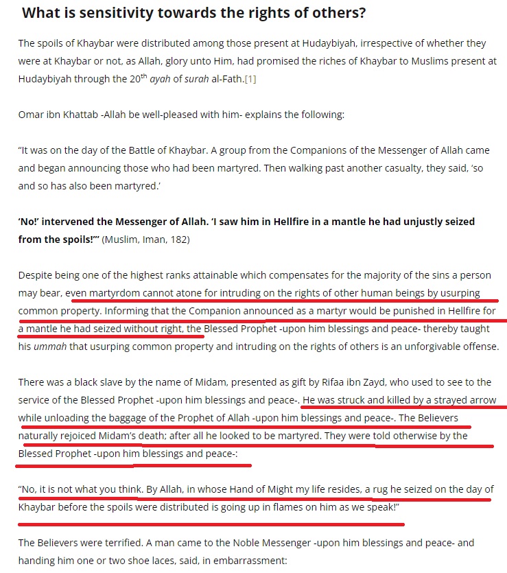 Yahya related to me from Malik from Thawr ibn Zayd ad-Dili from Abu’l-Ghayth Salim, the mawla of ibn Muti that Abu Hurayra said, “We went out with the Messenger of Allah, (saw), in the year of Khaybar. We did not capture any gold or silver except for personal effects, clothes, and baggage. Rifaa ibn Zayd presented a black slave boy to the Messenger of Allah, (saw), whose name was Midam. The Messenger of Allah, (saw), made for Wadi’l-Qura, and when he arrived there, Midam was unsaddling the camel of the Messenger of Allah,(saw), when a stray arrow struck and killed him. The people said, ‘Good luck to him! The Garden!’ The Messenger of Allah said, ‘No! By He in whose hand my self is! The cloak which he took from the spoils on the Day of Khaybar before they were distributed will blaze with fire on him.‘ When the people heard that, a man brought a sandal-strap or two sandal-straps to the Messenger of Allah, (saw). The Messenger of Allah, (saw), said, ‘A sandal-strap or two sandal-straps of fire!’ “