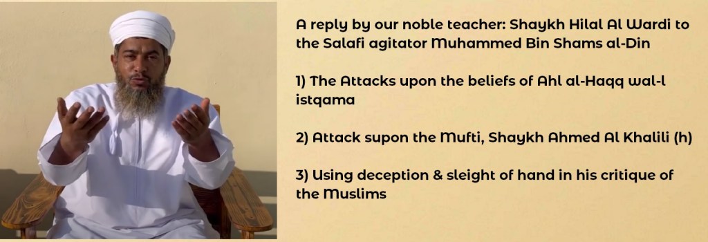 Responding to the claim of the Salafi agitator Ibn Shams al-Din about his claims against Ahl al-Haqq wa-l istiqama; as well as his claims against the Mufti of Oman and imminent scholar, Shaykh Ahmed Al Khalili (h)-May Allah bless him and continue to bless us by him.