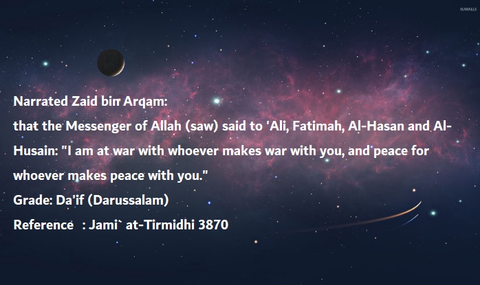That the Messenger of Allah (saw) said to ‘Ali, Fatimah (ra), Al-Hasan and Al-Husain (ra): “I am at war with whoever makes war with you, and peace for whoever makes peace with you.”