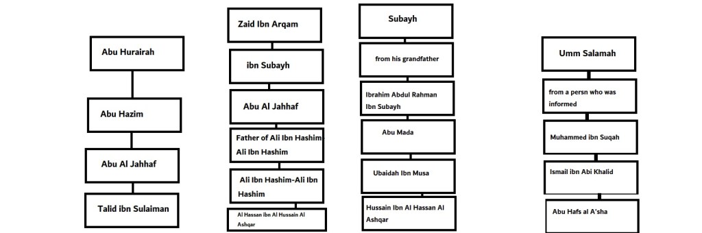 The hadith comes to us by four ways: Abu Hurairah, Zaid Ibn Arqam, Subayh, Umm Salamah: