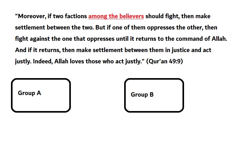 “Moreover, if two factions among the believers should fight, then make settlement between the two. But if one of them oppresses the other, then fight against the one that oppresses until it returns to the command of Allah. And if it returns, then make settlement between them in justice and act justly. Indeed, Allah loves those who act justly.” (Qur’an 49:9)