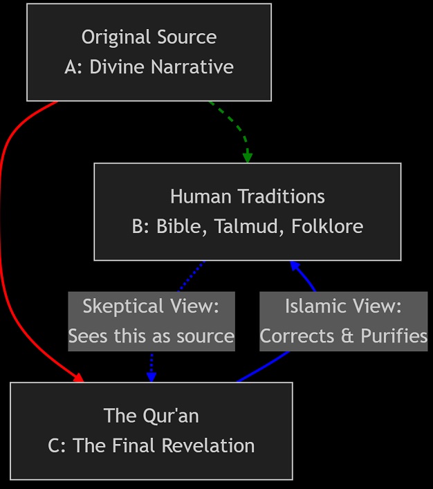 • The Islamic View (solid arrows) correctly identifies that both B and C draw from a common, older source (A). Therefore, when B contains elements that align with C, it doesn’t mean C copied B—it means B still contains remnants of the original truth (A) that the Qur’an (C) confirms and corrects.