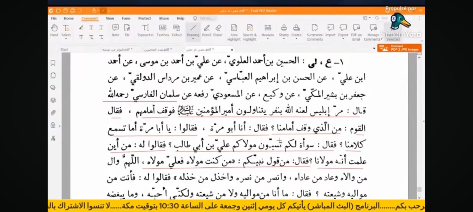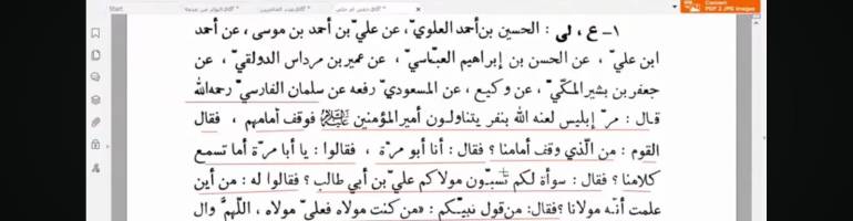 From Al-Hussayn B. Ahmad Al-Alawi From Ali B. Ahmad B. Ibn Ali From Hassan B. Ibrahim Al-Abbasy From Umayr B. Mirdas Al-Dawaqli From Ja’afar B. Nasheed Al-Malakeyyi From Waki’a From Al-Masoudi: That He Heard that Salman Al Farisi(May Allah have mercy on him)) Say: Iblees(May Allah’s curse be upon him) Once came upon a people that were backbiting The Amir ul Mumineen So, he stood in front of them and the people then said: : ‘Who is this that stands in front of us?’ He said: ‘I Am Abu Murrah’ Then they replied: “Do you not hear what we say?” So he said: “Do you insult your master Ali B. Abi Talib?” They then said: “And where did you get this that he is our master?” So He said: “From the sayings of your Prophet that “Whoever I am his master Ali is also his master. Oh Allah avow whoever avows him and disavow whoever disavows him and aid whoever aids him and abandon whoever abandons him.” So they then asked: “Are you of those who Avow him and of his party?’” He replied: “I am not of those who avow him nor am I of his party but I am one who loves him.“