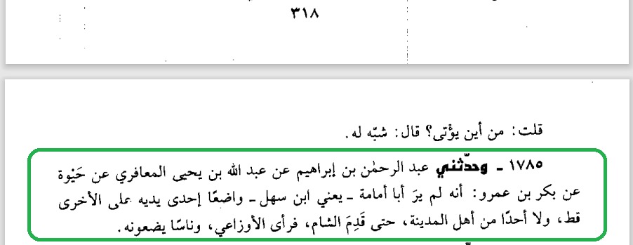 وحدثني عبد الرحمن بن إبراهيم عن عبدالله بن يحيى المعافري عن حيوة عن بكر بن عمرو أنه لم ير أبا أمامة -يعني ابن سهل- واضعا إحدى يديه على الأخرى قط ولا أحدا من أهل المدينة حتى قدم الشام فرأى الأوزاعي وناسا يضعونه
