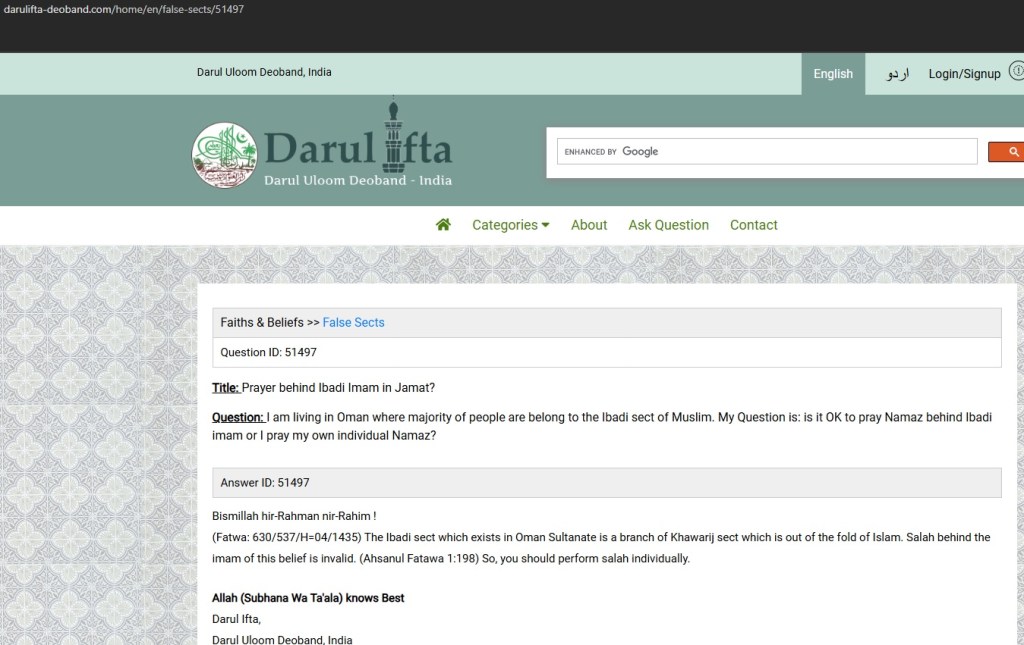 So here is the view of Darul Ifta, Darul Uloom Deoband, Sunni Muslims who are primarily Hanafi in jurisprudence, and Māturīdī in theology who are saying praying behind an Ibadi is invalid.