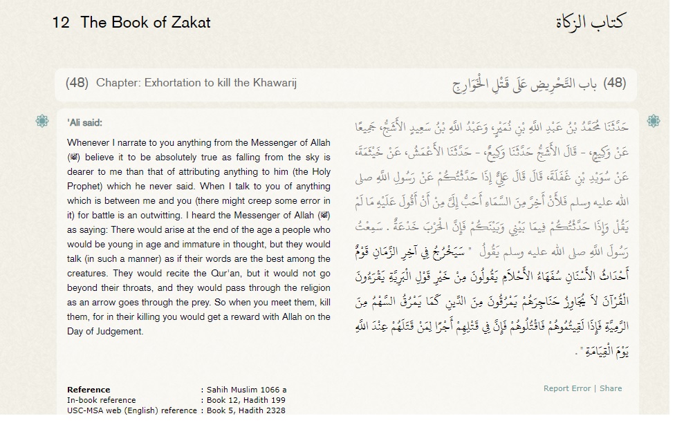 “It is largely based on the following hadith, which both groups like to use to justify the killing of those who leave Islam and to portray this as the ‘true teachings of Islam’. ”