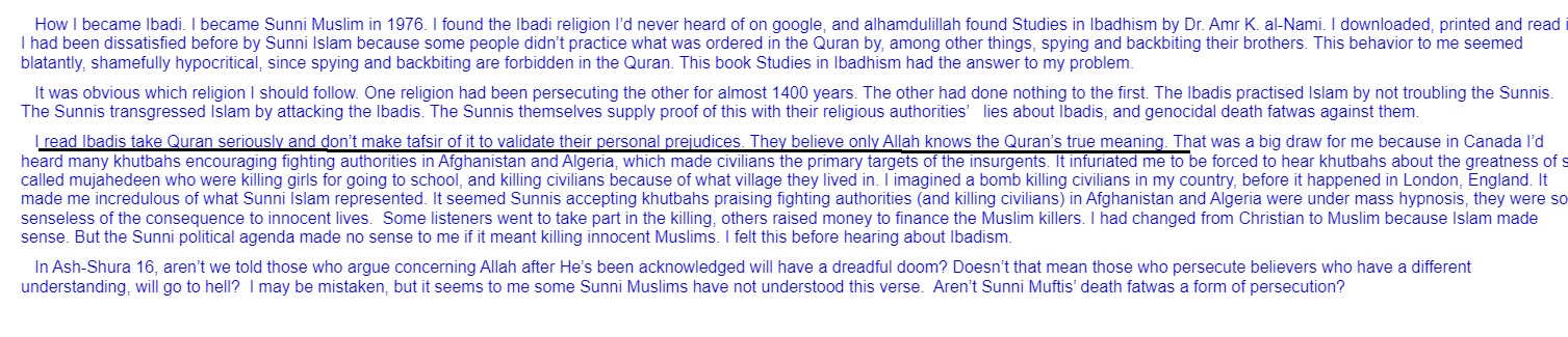 “I read Ibadis take Qur’an seriously and don’t make tafsir of it to validate their personal prejudices. They believe only Allah knows the Qur’ans true meaning.”