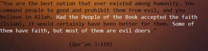 “You are the best nation that ever existed among humanity. You command people to good and prohibit them from evil, and you believe in Allah. Had the People of the Book accepted the faith (Islam), it would certainly have been better for them. Some of them have faith, but most of them are evil doers.” (Qur’an 3:110)