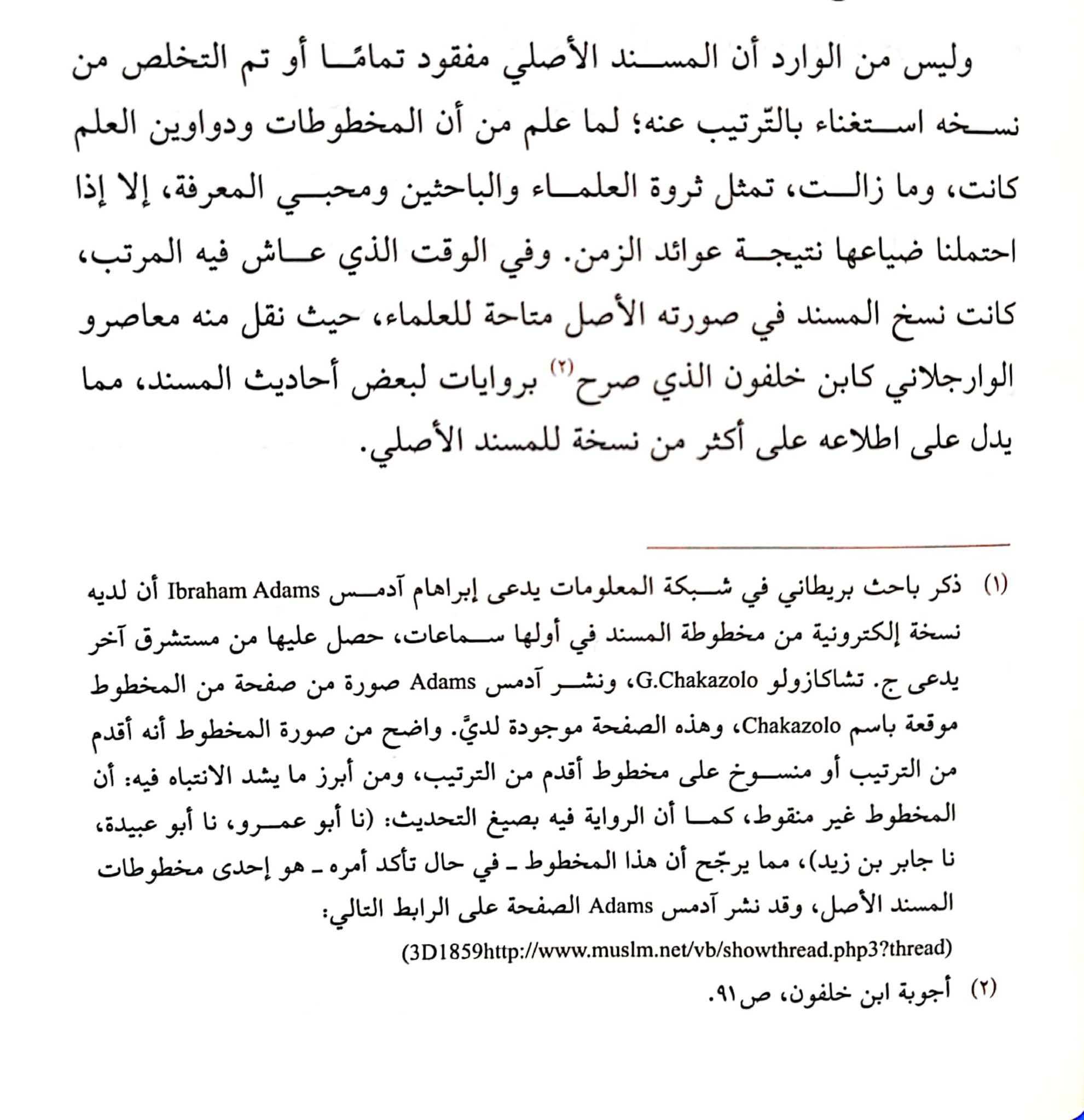 “A manuscript of the Musnad of Imam Rabe’ bin Habeeb was found on the web, that a British researcher (Ibrahim Adam), has shared a page of it on his website. He received this from another researcher, (G. Chakazolo), and it’s clear from the photo that’s it either an older manuscript than the Tarteeb or that it was copied from a version older than the tarteeb, and what makes it interesting is that the manuscript was not dotted. This makes it ore likely that it’s one of the original copies of the musnad and Adam’s has shared this photo on his website.” -Abu Nahrawan