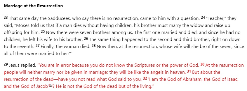 “Jesus replied, “You are in error because you do not know the Scriptures or the power of God.” “At the resurrection people will neither marry nor be given in marriage; they will be like the angels in heaven.” (Matthew 22:29-30)