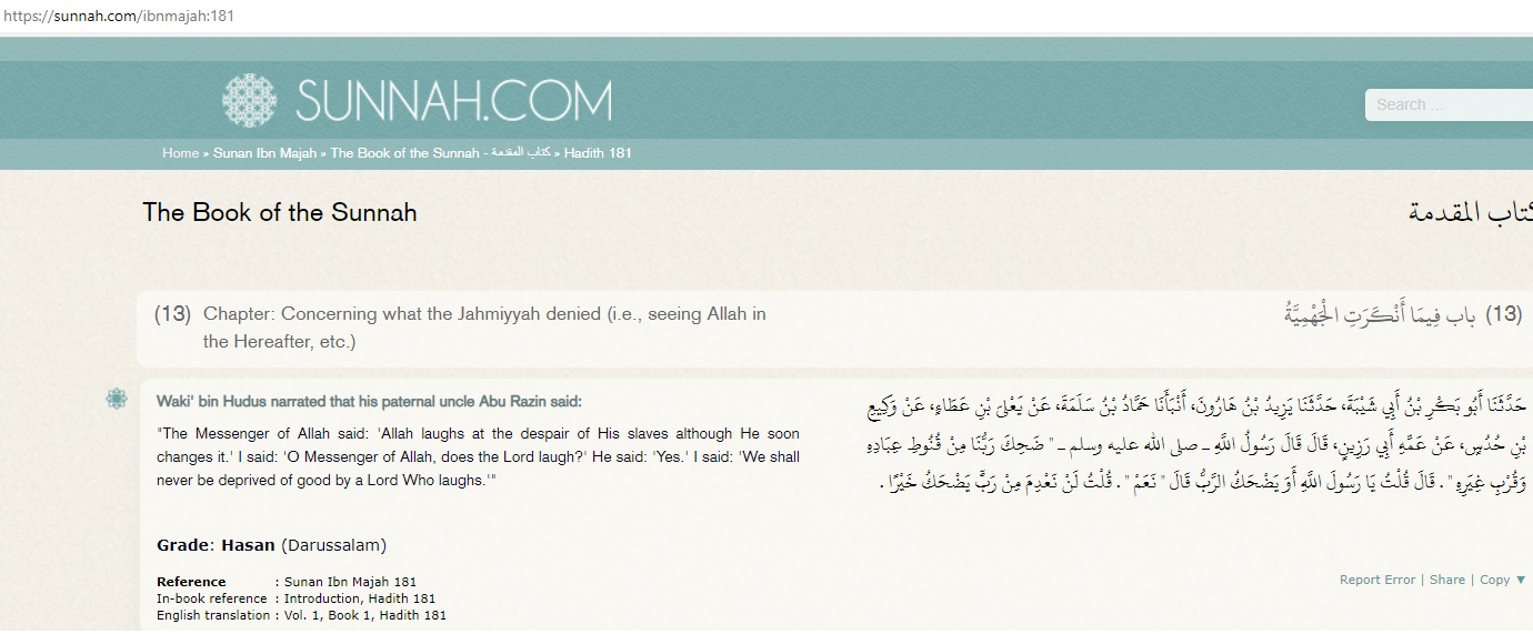 “The Messenger of Allah said: ‘Allah laughs at the despair of His slaves although He soon changes it.’ I said: ‘O Messenger of Allah, does the Lord laugh?’ He said: ‘Yes.’ I said: ‘We shall never be deprived of good by a Lord Who laughs.'”