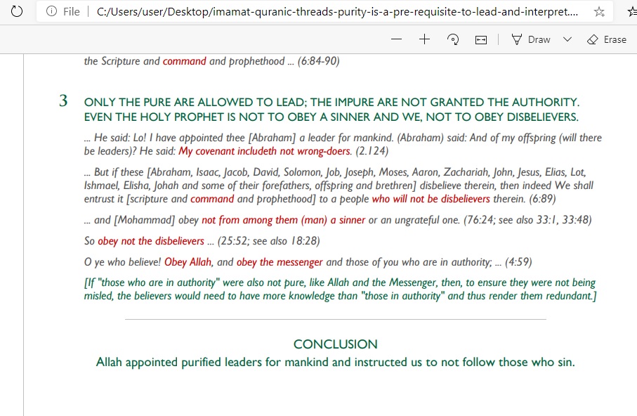 “Since we are unable to judge — perfectly and without error — who are the pure, Thread III will address the apparently impossible command not to follow disbelievers or those who have sinned. Indeed, Allah has said He will judge wherein we differ (42:10,22:67-69,5:48,39:46,6:164, etc.), thus precluding us from even making such assessments.”