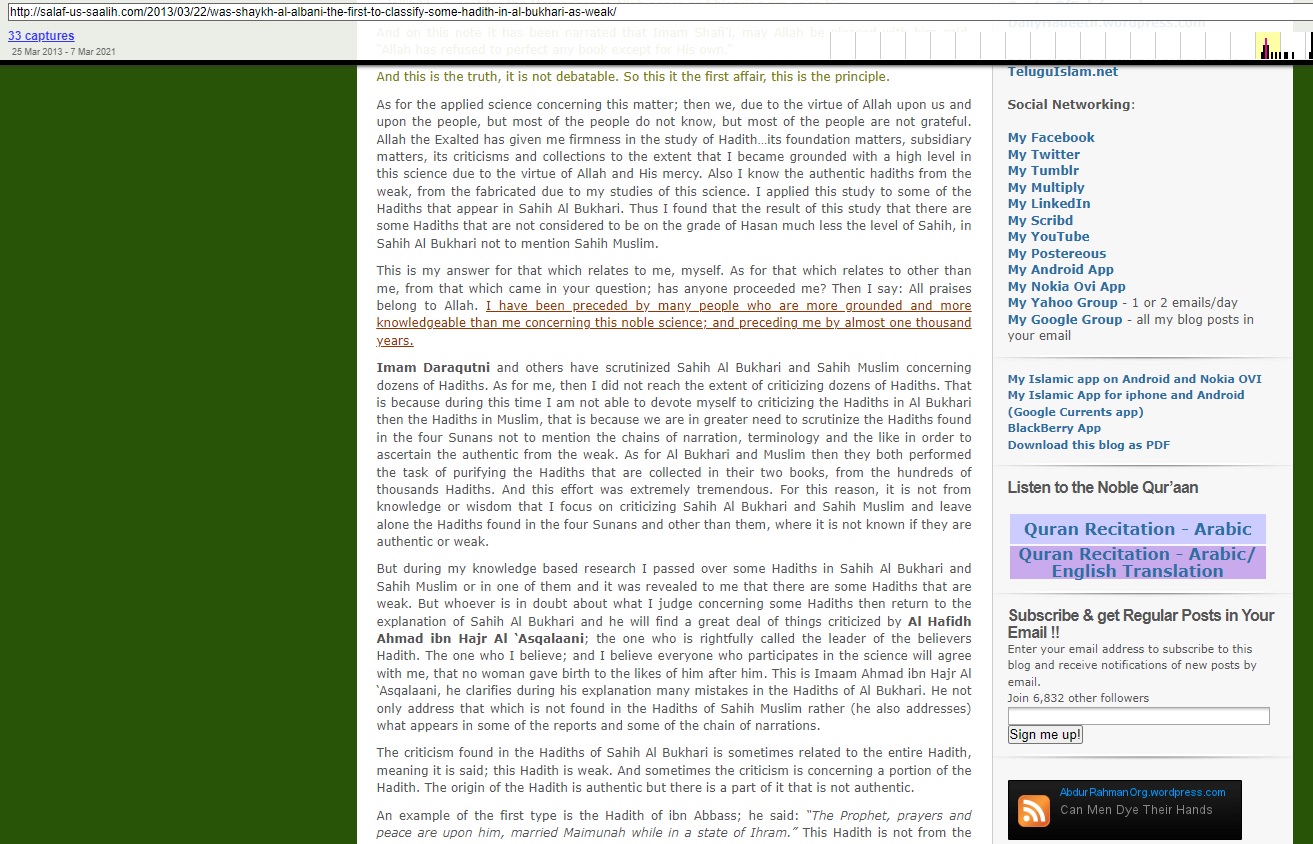“As for me, then I did not reach the extent of criticizing dozens of Hadiths. That is because during this time I am not able to devote myself to criticizing the Hadiths in Al Bukhari then the Hadiths in Muslim…”