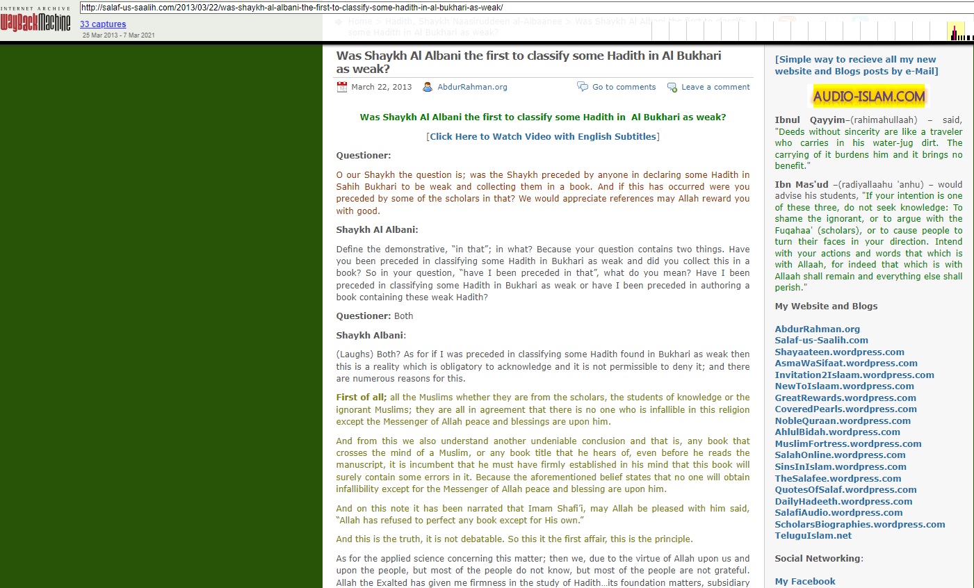 “Thus the answer is complete in reference to the first condition, meaning I criticized some Hadiths and I have been proceeded by many Imaams. As for did I or someone other than me author a book (surrounding this topic) then I did not author a book. As for other than me, then they have authored books, but we are not able to mention a book today in this regard. This is the answer to what you asked.” -Shaykh Al Albani