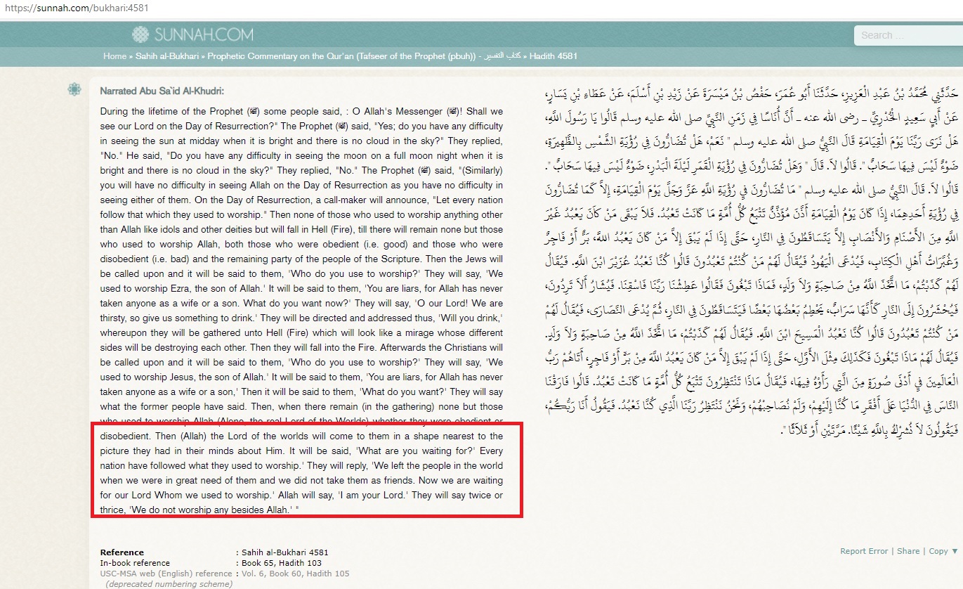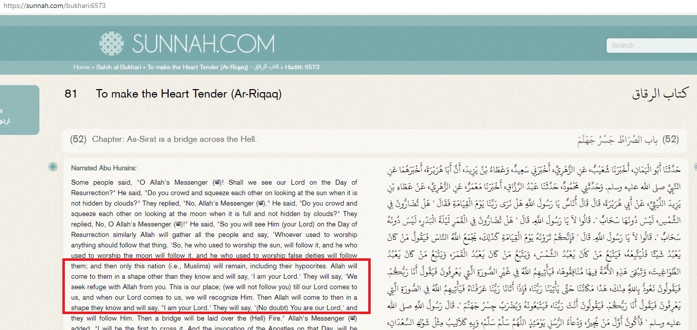 “People asked the Prophet (saw): O’ Messenger of Allah will we see our Lord in the Day of Resurrection? Then the Messenger of Allah replied: Is there any dispute among you whether a full moon is visible? They answered: No. then The Prophet (saw) continued asking them: “ Is there any dispute among you whether the sun is visible in a cloudless sky? They replied in the negative. Then The Prophet stated (saw): “Then you will see your Lord JUST LIKE this”. Allah will get the people together in the Day of Resurrection then He says: those who were worshiping any deity shall follow it. Then the ones who were worshiping the sun will follow the sun and the ones who were worshiping the moon will follow the moon and those who were worshiping Rebels will follow Rebels …Then Allah will come to them in a FORM other than WHAT THEY KNEW and say: “I am your Lord”, they reply: “We seek refuge in Allah from you. This is our place until our Lord Comes to us, and when our Lord comes to us, we will recognize Him. THEN ALLAH WILL COME TO THEM IN A SHAPE THEY KNOW and will say, I am your Lord’ They will say, ‘(No doubt) You are our Lord,’ and they will follow Him.”