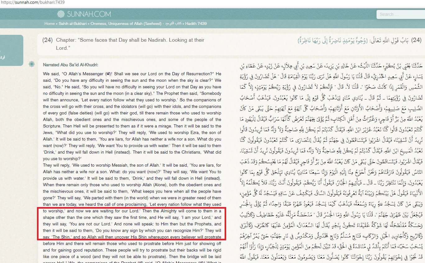 “Then the Almighty will come to them in a shape other than the one which they saw the first time, and He will say, ‘I am your Lord,’ and they will say, ‘You are not our Lord.’ And none will speak: to Him then but the Prophets, and then it will be said to them, ‘Do you know any sign by which you can recognize Him?’ They will say. ‘The Shin,’ and so Allah will then uncover His Shin whereupon every believer will prostrate before Him.”
